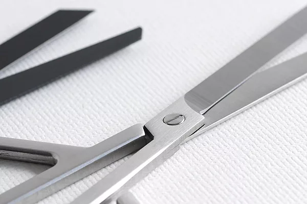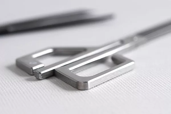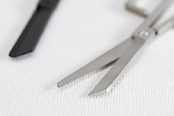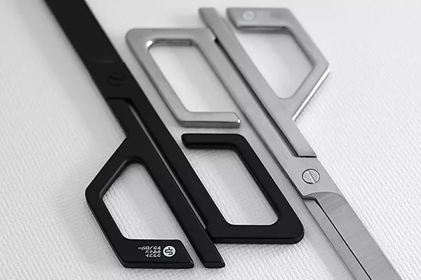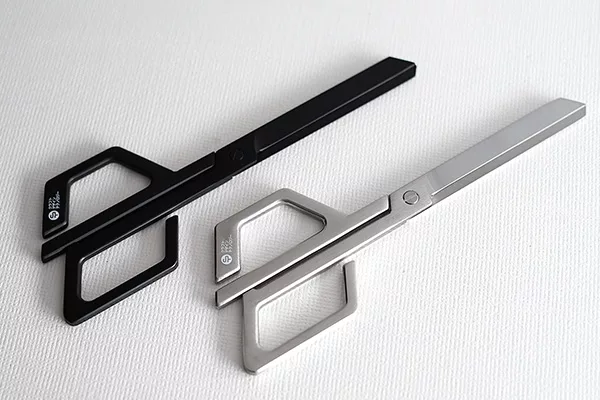 CDT剪刀是左、右手兼用款,使用不鏽鋼材質製造。剪刀本體採用非常幾何的造型,就連剪刀的邊角也多修出幾道斜邊、加強它的幾何設計、也讓無機質的金屬特色更為強調。